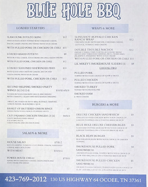 The Blue Hole BBQ has moved from The Ocoee River Experience to 130 Hy 64 in Ocoee (next to McDonalds).